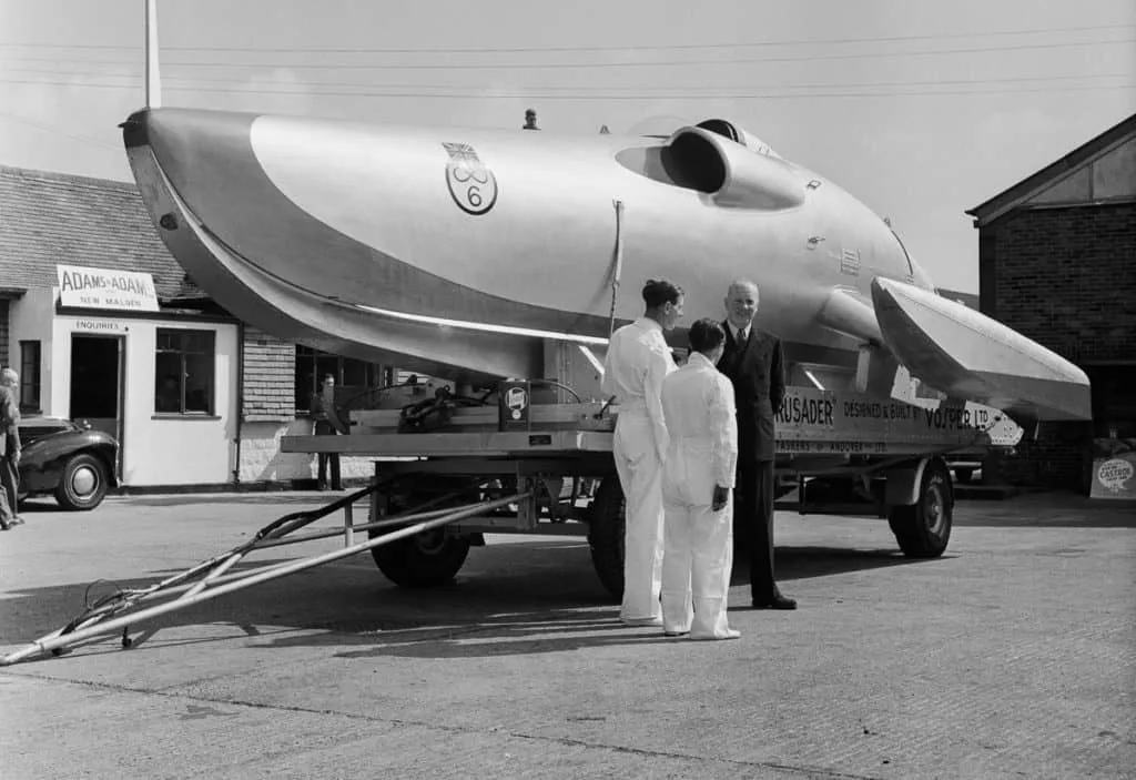 Cobb turned to engineer Reid Railton, who had already designed some of Cobb’s vehicles. The two began testing concepts for a trimaran jet-boat. By having small outriggers on either side of a narrow hull they would maintain stability while keeping surface area low, allowing the boat to shoot over the surface of the water instead of plowing through it. The tests showed promise. They borrowed a jet engine from the Ministry of Supply and built Crusader in 1952. Crusader was 31 feet long, built with a birch frame and wrapped in aluminium.